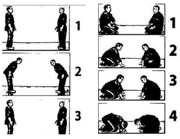 Con sus raíces fundadas en el ceremonial de los pueblos orientales, con un sublime código de respeto, rectitud, honor, deferencia hacia la categoría superior, como dedicación y entrega al que practica de grado inferior. El saludo es el protocolo marcial base de los míticos y valientes guerreros orientales, en cuanto a las dos formas de saludo existentes por excelencia son el saludo de pie y el saludo sobre las rodillas.
