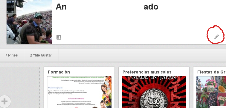 A continuación, en la página principal de su perfil donde puede visualizar los tableros y «pines» creados por usted, en la parte derecha de cabecera, existe un pequeño icono en forma de «lápiz». Haciendo «clic» en el mismo obtendrá otra pantalla en la que puede completar una serie de informaciones relativas a usted y a los propósitos de su perfil en Pinterest.
