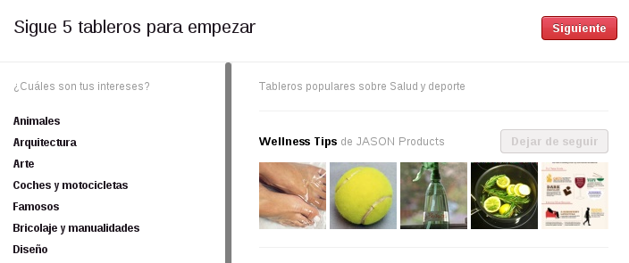 Para empezar, debe seguir cinco tableros (colecciones de pines que crean los usuarios). Procure en la medida de lo posible que sus elecciones temáticas se aproximen a las actividades que realiza profesionalmente. En todo caso, no se preocupe, pues estas elecciones iniciales son reversibles y podrá dejar de seguir a estos tableros un poco más adelante.