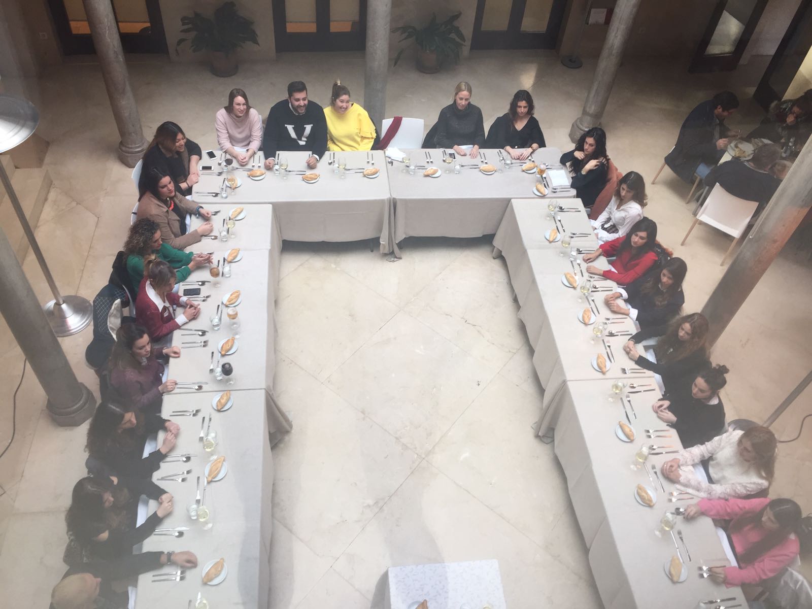 En nuestro caso se ha tratado de un almuerzo sentados; como disposición se ha escogido una “Mesa en U”, para que todos los comensales tuviésemos contacto visual entre nosotros, y al mismo tiempo pudiésemos seguir las indicaciones de nuestra maestra de ceremonias, Julia Vaño Esteban, subdirectora de la Escuela Internacional de Protocolo de Granada-