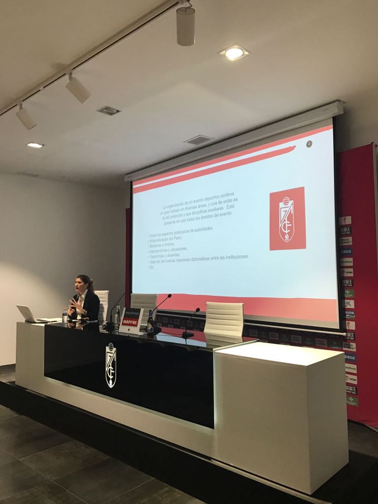 La anfitriona de esta visita Neus Méndez Carbonell, jefa de protocolo del club, les mostró a nuestros alumnos las dependencias del Nuevo Estadio de Los Cármenes e igualmente, en una interesante conferencia, les decubrió entresijos y la idiosincracia propia del protocolo de un club de fútbol de élite como es el Granada Club de Fútbol.