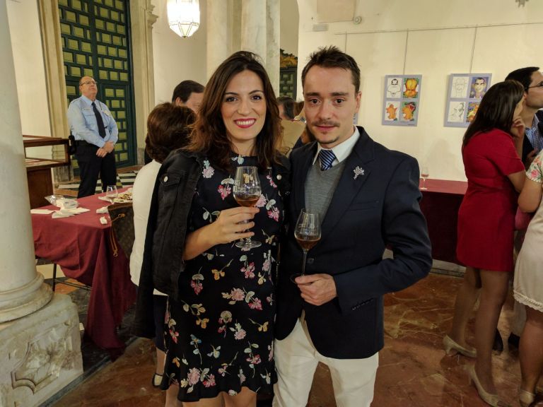 (FOTO 1) En la primera foto podemos ver al alumno de EIP Granada, Enrique Salinas, colaborando en la organización de la recepción de autoridades en el Patio Barroco del Palacio de la Merced el día 17 de abril por la noche. Durante esta recepción estuvieron presentes autoridades nacionales (subdelegado de Gobierno), autonómicas (consejera de agricultura), provinciales y locales (presidente de la diputación y alcaldes de los pueblos y ciudades adheridos a la D.O.P. Montilla-Moriles). También estuvo presente el Presidente del Consejo Regulador, Don Javier Martín (segundo por la izquierda).