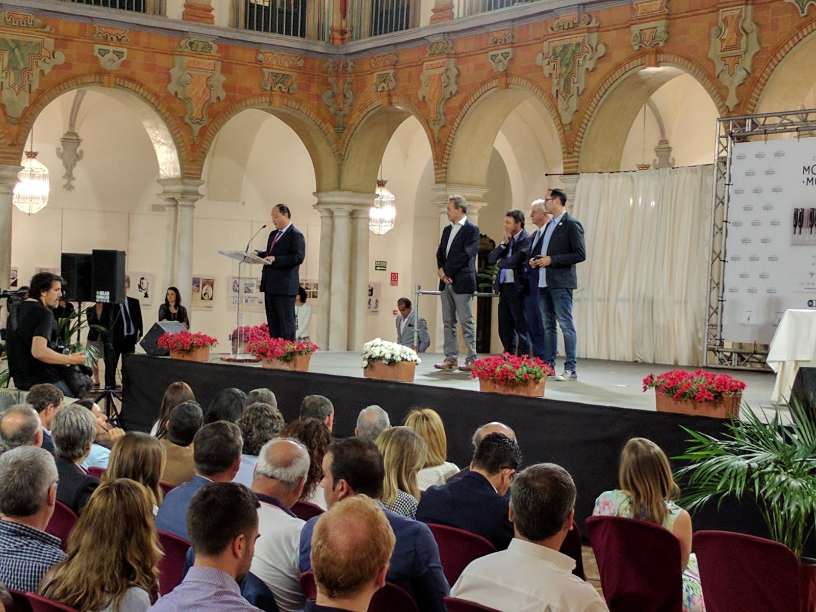 (FOTO 1) En la primera foto podemos ver al alumno de EIP Granada, Enrique Salinas, colaborando en la organización de la recepción de autoridades en el Patio Barroco del Palacio de la Merced el día 17 de abril por la noche. Durante esta recepción estuvieron presentes autoridades nacionales (subdelegado de Gobierno), autonómicas (consejera de agricultura), provinciales y locales (presidente de la diputación y alcaldes de los pueblos y ciudades adheridos a la D.O.P. Montilla-Moriles). También estuvo presente el Presidente del Consejo Regulador, Don Javier Martín (segundo por la izquierda).