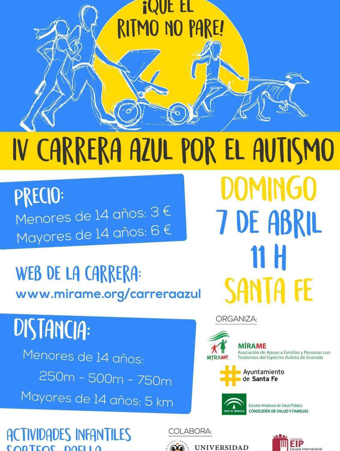 La Asociación MÍRAME, la Escuela Andaluza de Salud Pública y el Ayuntamiento de Santa Fe, con la colaboración del Vicerrectorado de Responsabilidad Social, Igualdad e Inclusión de la Universidad de Granada y la Escuela Internacional de Protocolo de Granada, y la presencia de numerosas firmas patrocinadoras, han puesto en marcha la IV edición de la Carrera Azul por el Autismo. Un evento de referencia a nivel nacional para visibilizar y concienciar sobre el trastorno del espectro del autismo, que reúne cada año en la localidad granadina de Santa Fe a más de 2.500 corredores/as y a 4.000 asistentes al recinto del evento.