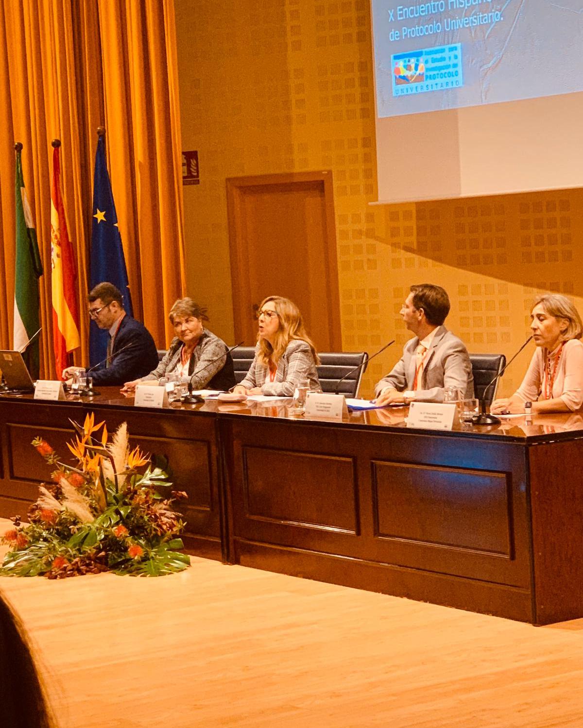 La directora de la Escuela Internacional de Protocolo de Granada, Manuela Suárez Pinilla, en calidad de representante del Gabinete de Relaciones Institucionales y Protocolo de la Universidad de Granada (donde recientemente se ha jubilado), en el marco del «XVIII Encuentro de Responsables de Protocolo y Relaciones Institucionales de las Universidades Españolas» y el «X Encuentro Hispano-Luso de Protocolo Universitario», que se celebra hoy y mañana en la Universidad Pablo de Olavide, ha participado en una Mesa redonda sobre «Estructura organizativa y funciones del responsable de protocolo universitario. Divergencias entre universidades y confluencia con otros cargos de responsabilidad». Este espacio de debate ha contado con otros responsables de protocolo de otras universidades como Alfonso Díaz (U. de Cantabria), Salustiano Martínez (U de Cádiz), María Emilia Bermejo (U. de M. Hernández) y Jana Valdés. (Univ. Autónoma de Madrid), la sesión ha sido moderada por Elvira Sanz (U. de Almería).